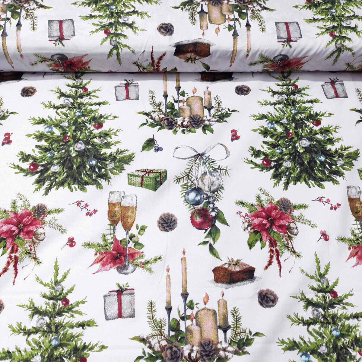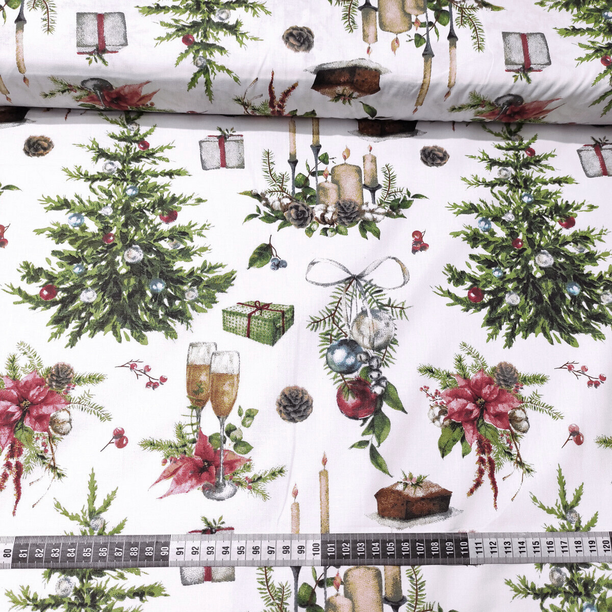 Świąteczna tkanina bawełniana wzór Drzewko Świąteczne na białym tle
