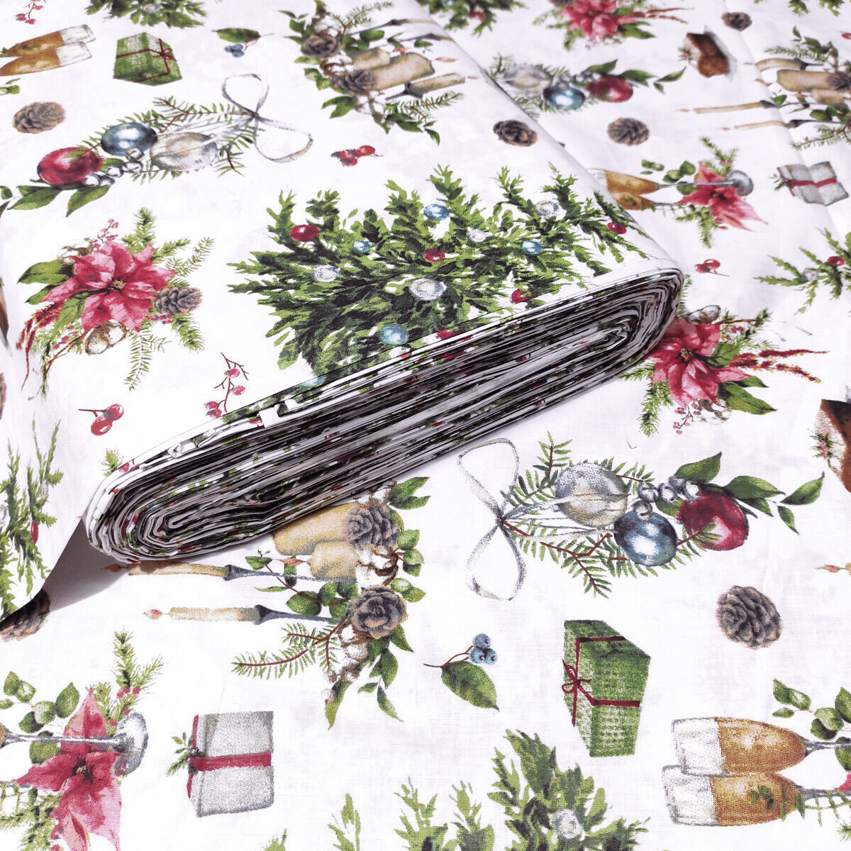Tkanina bawełniana jest ozdobiona pięknym bożonarodzeniowym wzorem, który doda świątecznego czaru do każdego projektu. To świetny wybór na produkcję pościeli, obrusów, zasłon, dekoracji domu i innych ręcznie robionych przedmiotów.