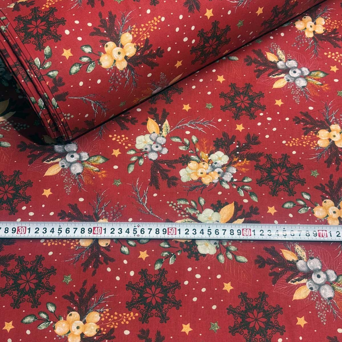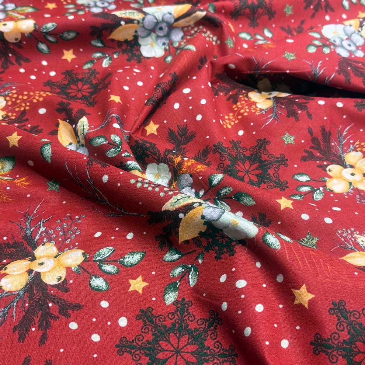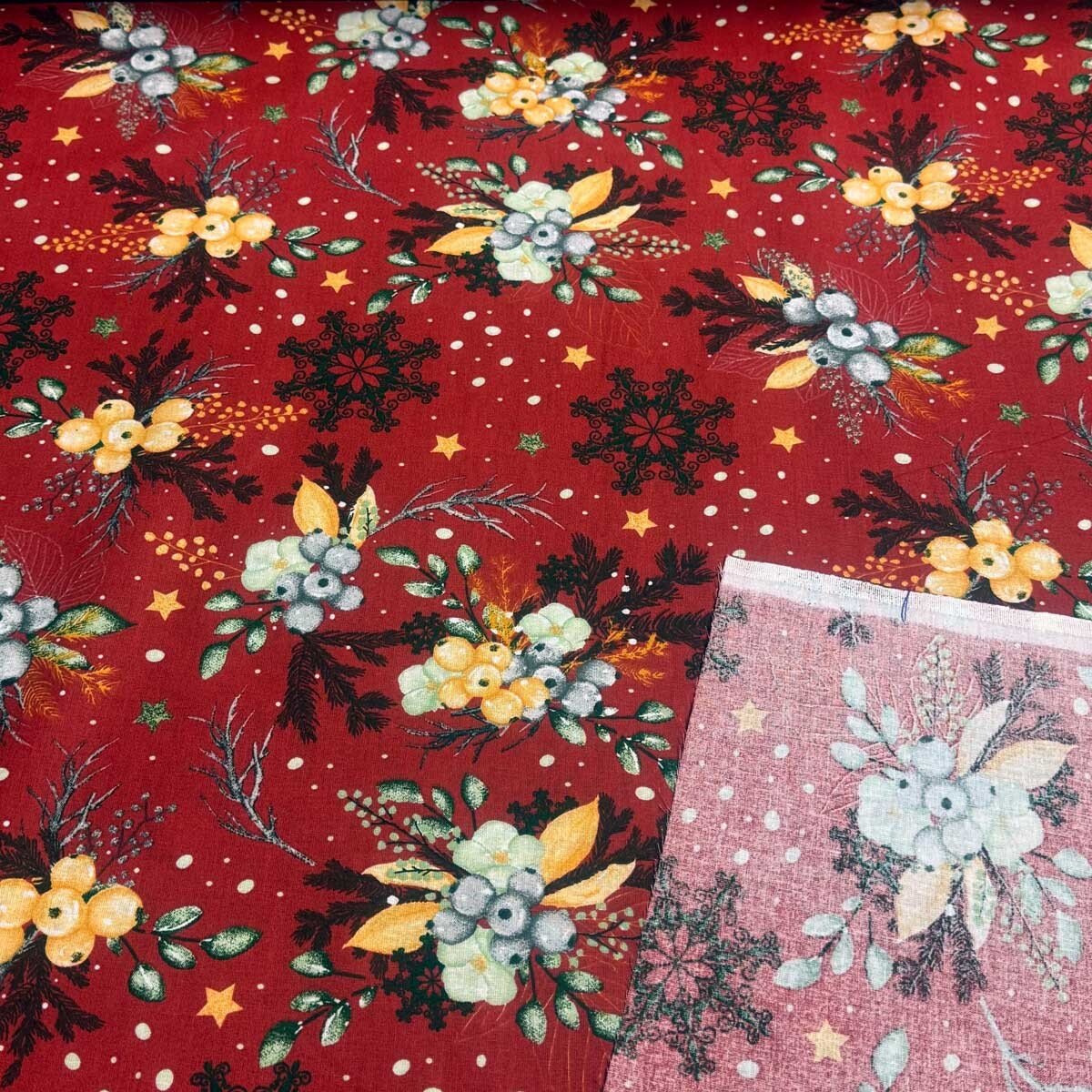 Tkanina bawełniana jest ozdobiona pięknym bożonarodzeniowym wzorem, który doda świątecznego czaru do każdego projektu. To świetny wybór na produkcję pościeli, obrusów, zasłon, dekoracji domu i innych ręcznie robionych przedmiotów.