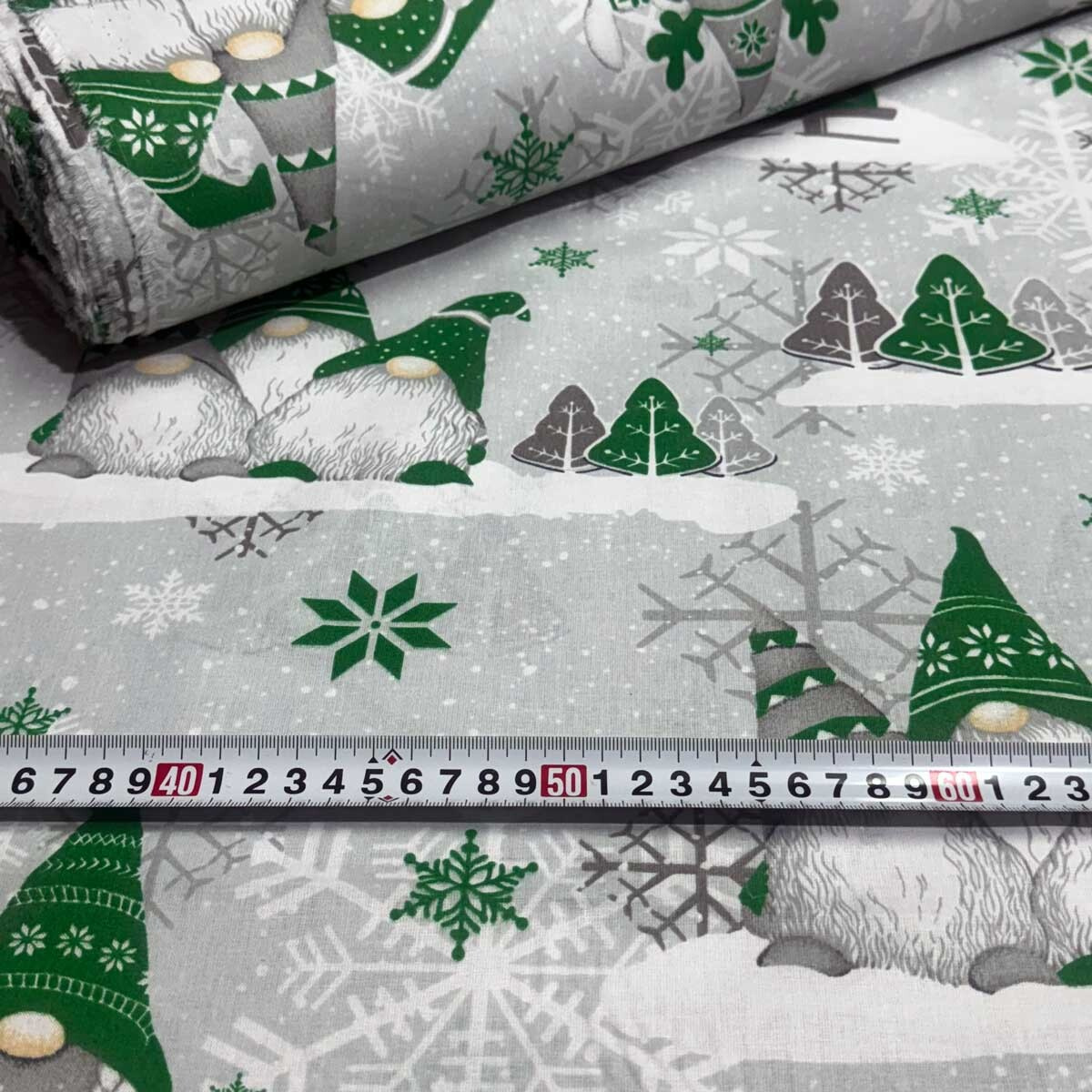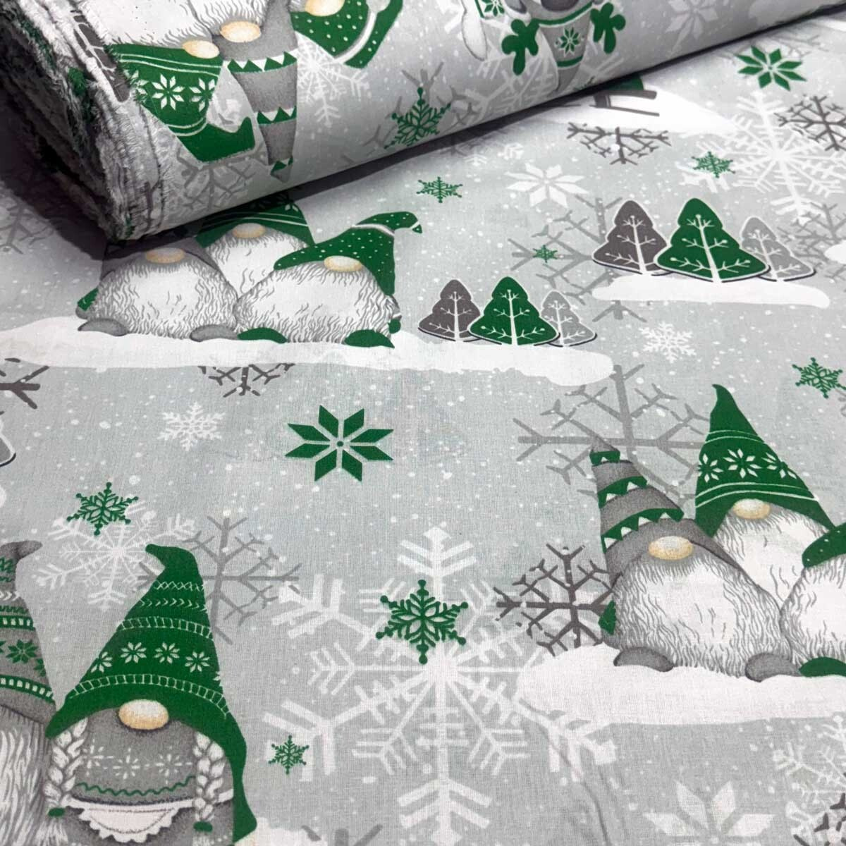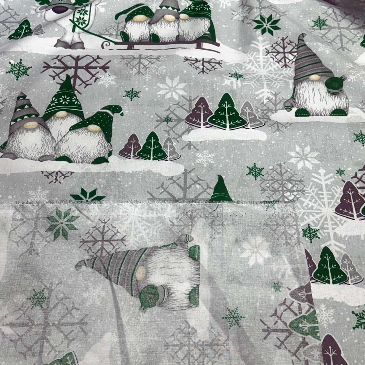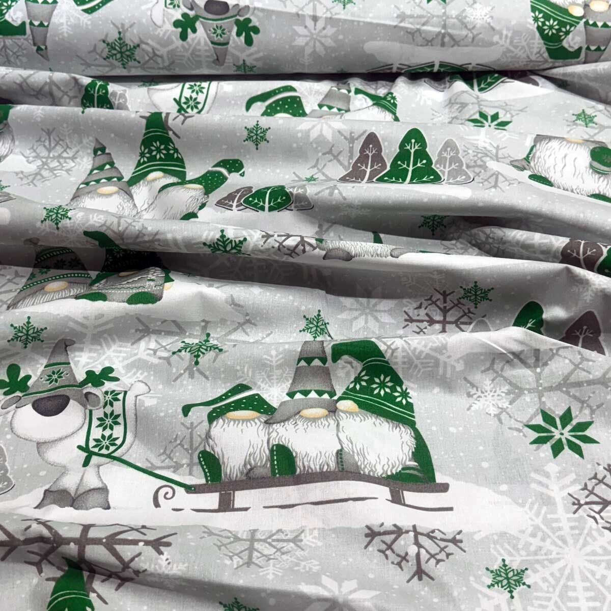 Świąteczna tkanina bawełniana wzór szaro-zielone Skrzaty