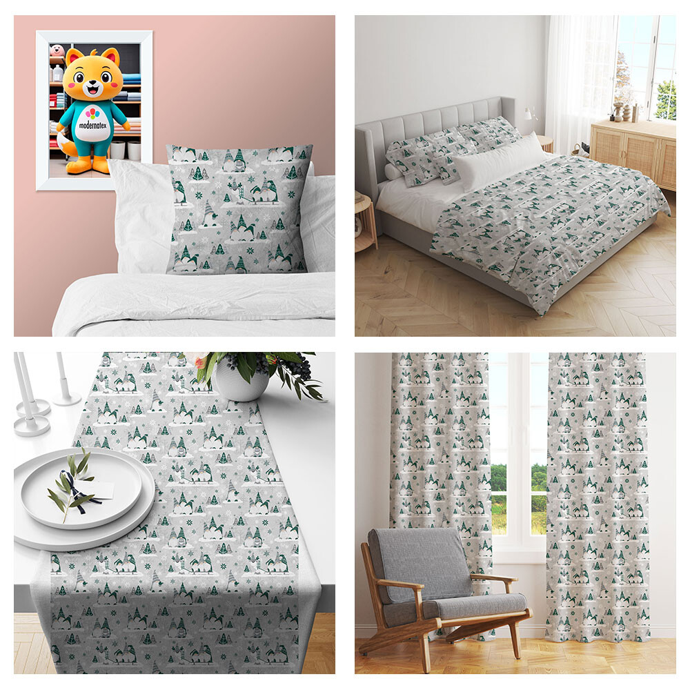 Opis Świąteczna tkanina bawełniana wzór szaro-zielone Skrzaty