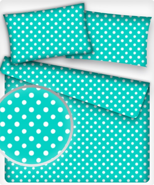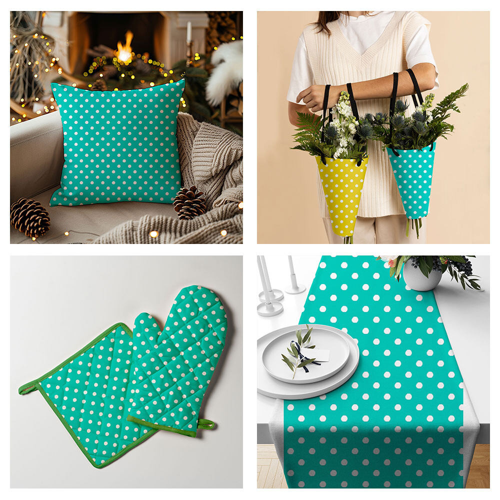Opis Tkanina bawełniana Białe groszki 10 mm na mentolowym tle