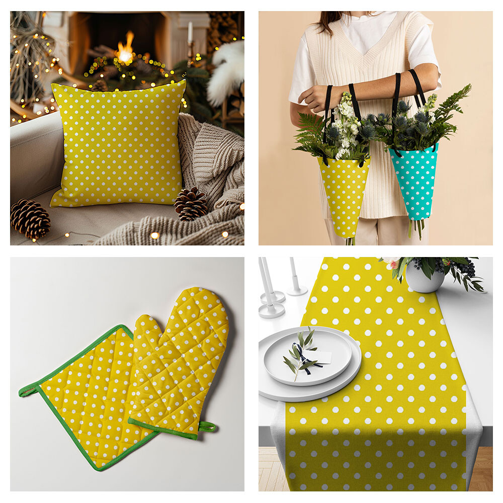 Opis Tkanina bawełniana Białe groszki 10 mm na żółtym tle
