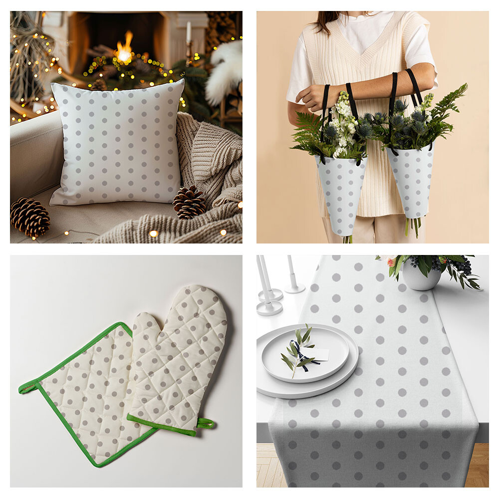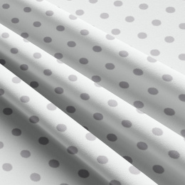 Opis Tkanina bawełniana Szare groszki 22 mm na białym tle