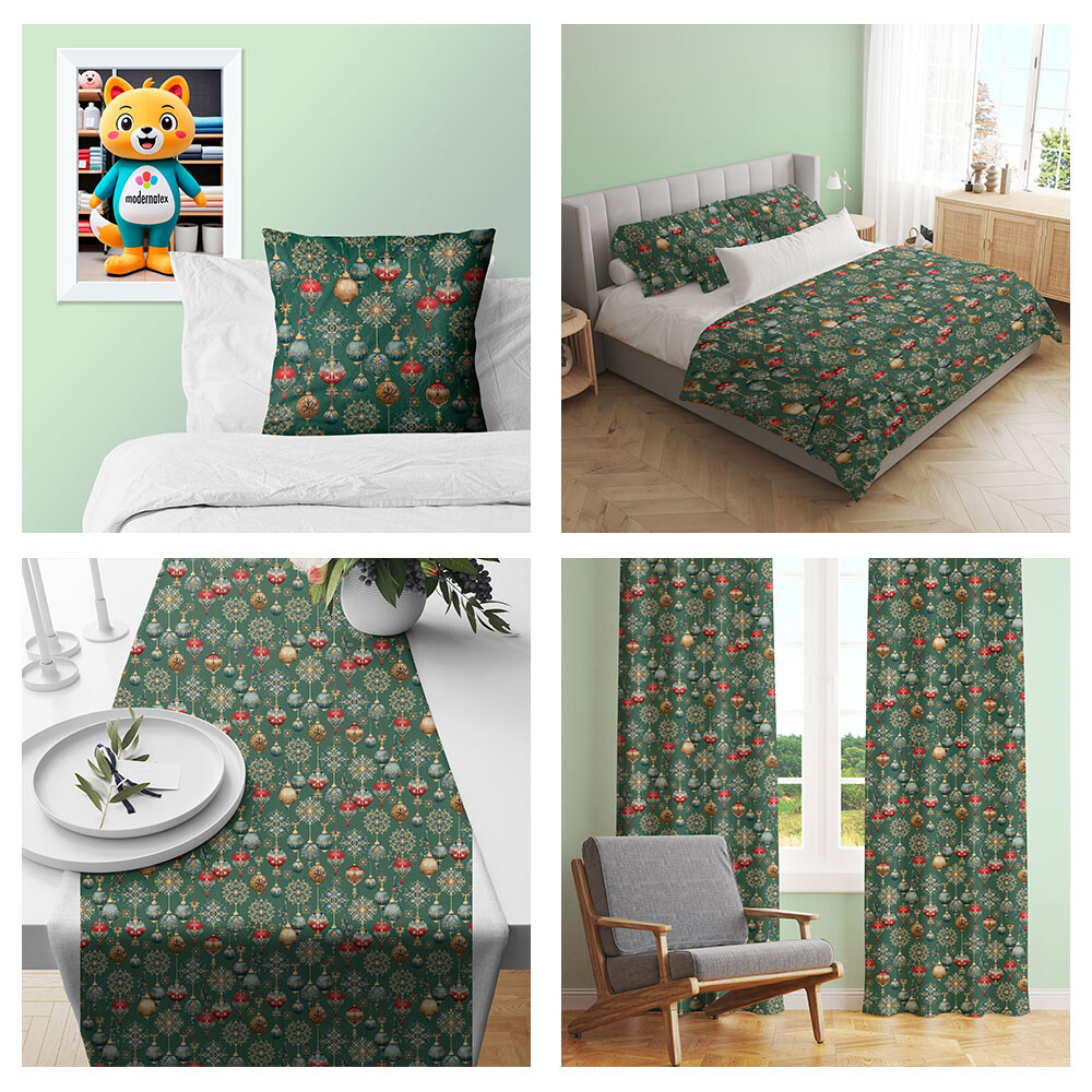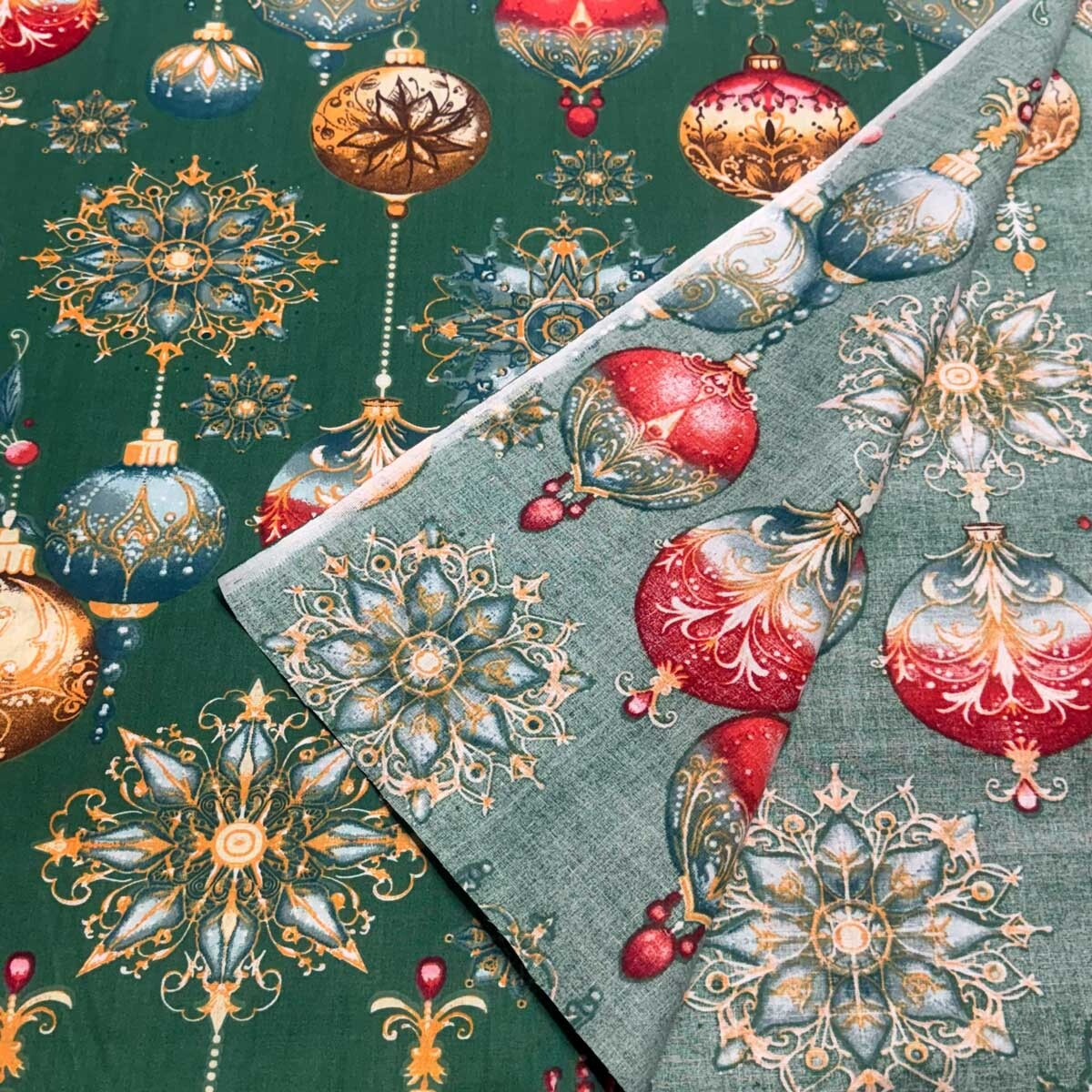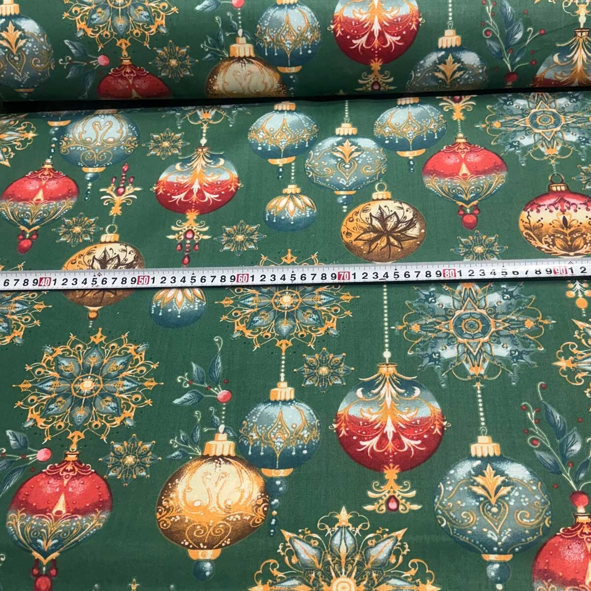 Opis Tkanina bawełniana wzór Bombki na zielonym tle