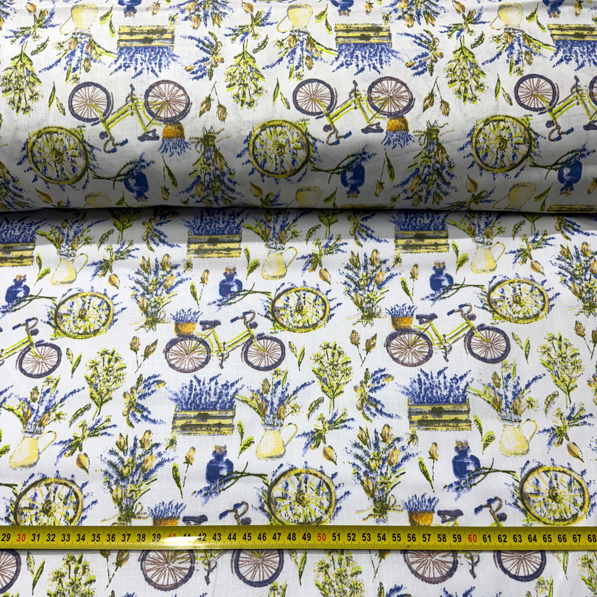 Opis Tkanina bawełniana wzór Kwiatów i Rower na białym tle