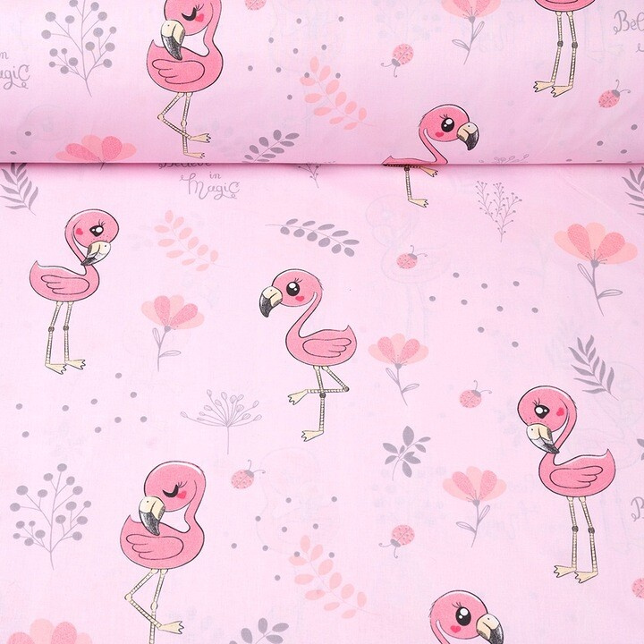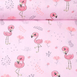 Opis Tkanina bawełniana wzór szare flamingi Baby na różowym tle