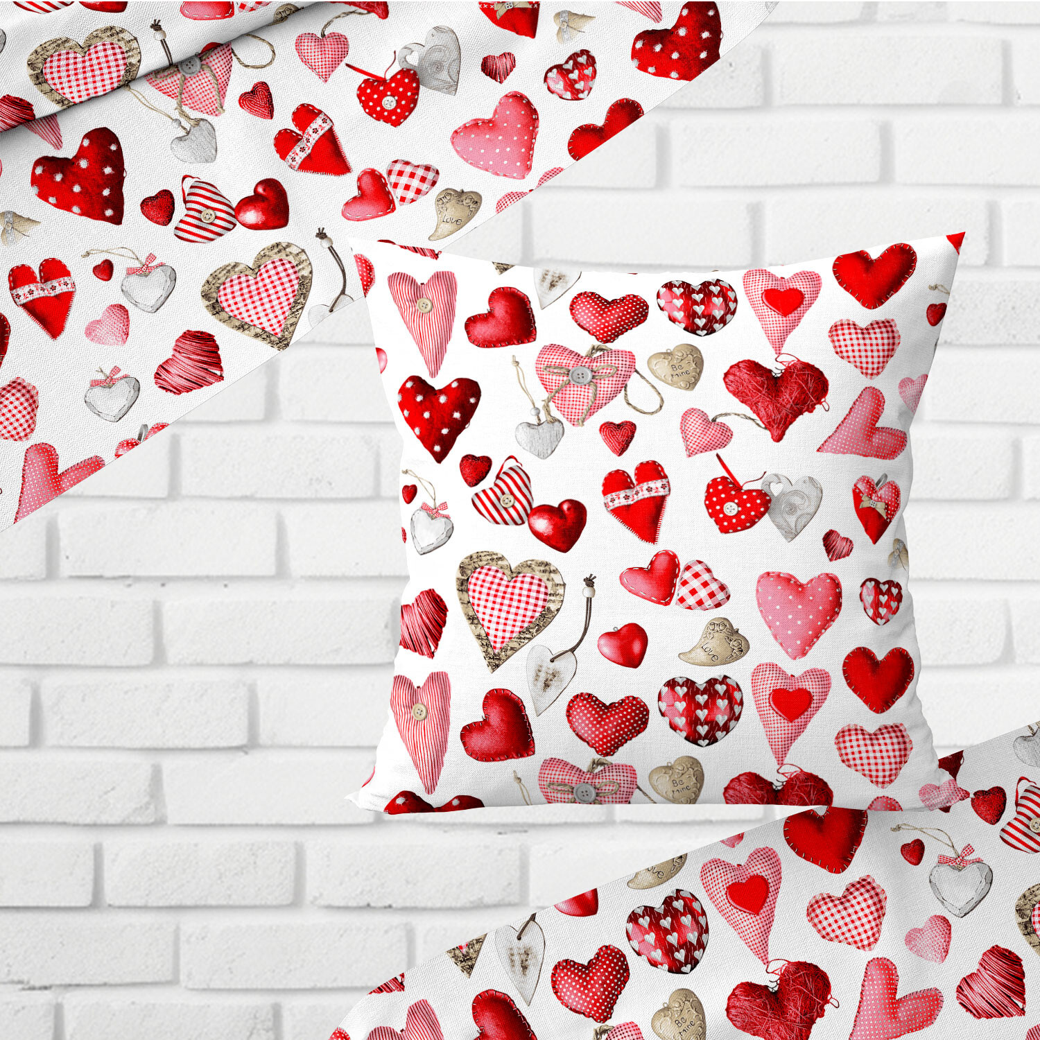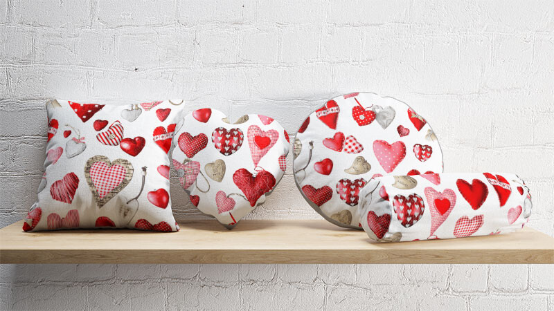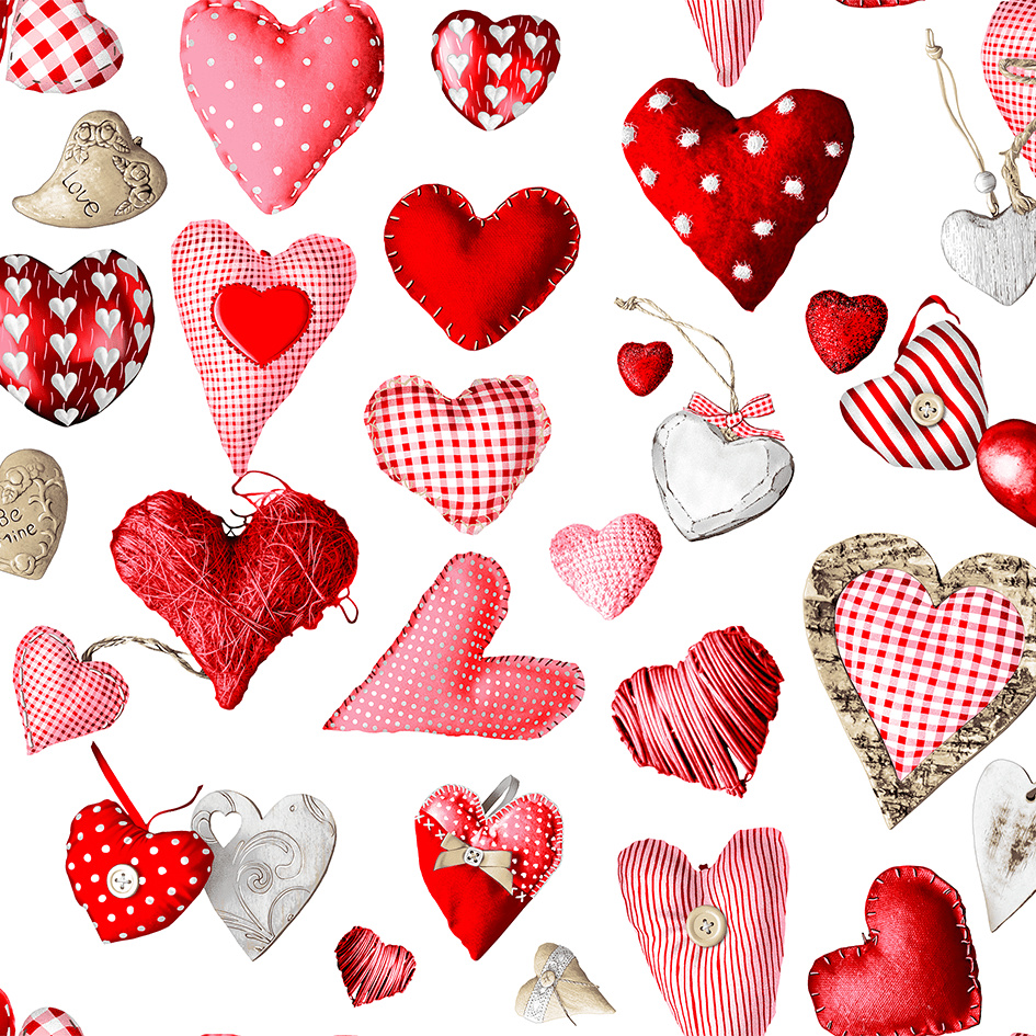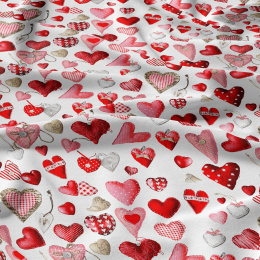 Opis Tkanina bawełniana wzór wielokolorowe serca na białym tle