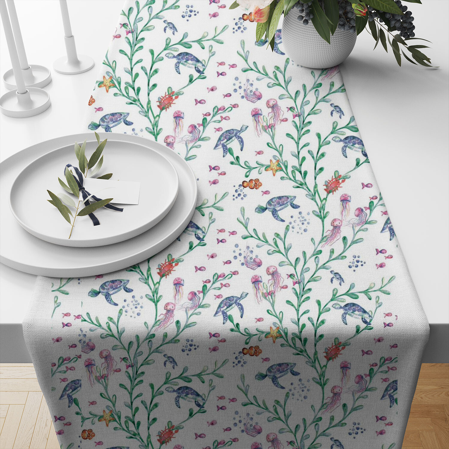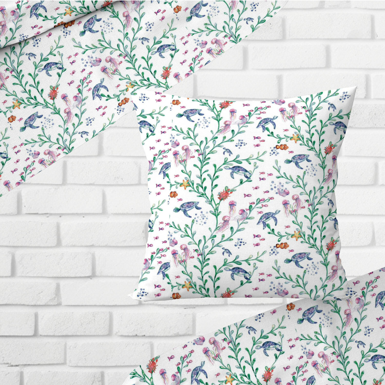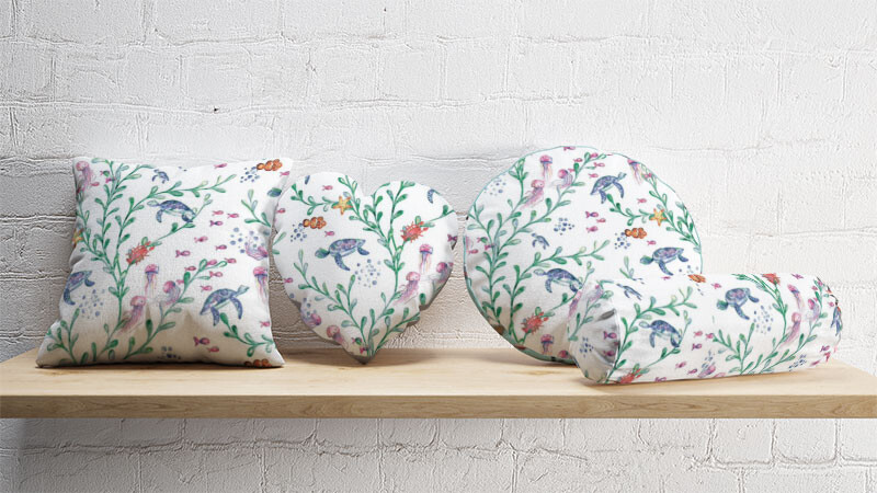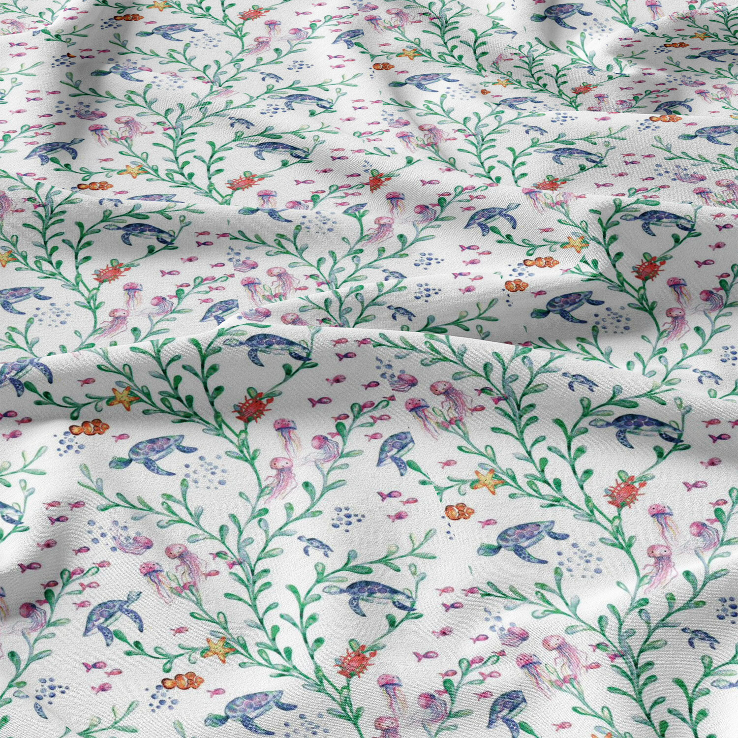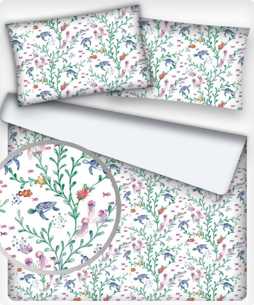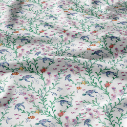 Opis Tkanina bawełniana wzór Wodny świat na białym tle