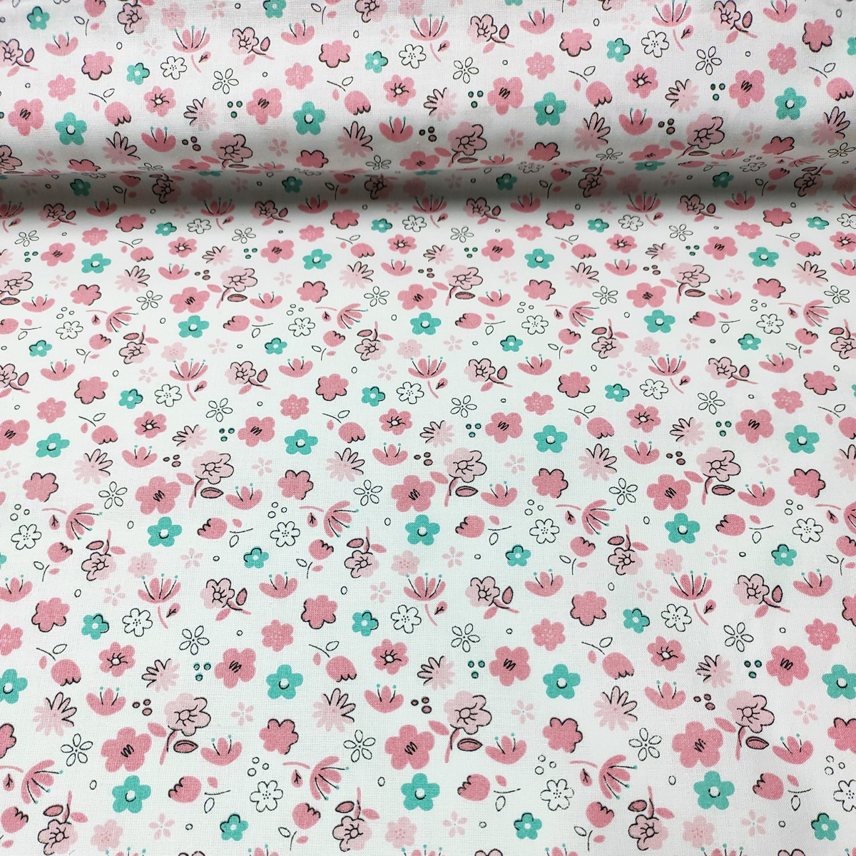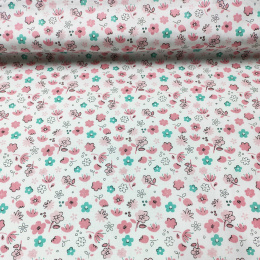 Opis Tkanina bawełniana ze wzorem nowoczesnych różowych kwiatów na białym tle