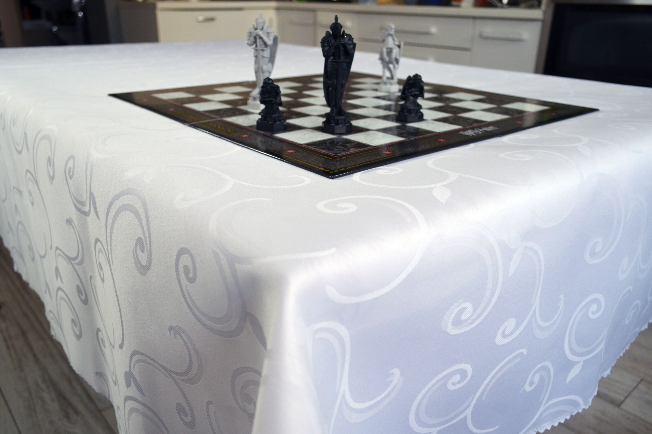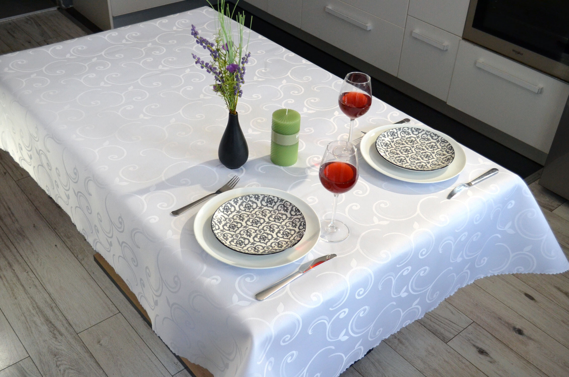 • Uniwersalny design: Klasyczny biały kolor sprawia, że obrus pasuje do każdego wnętrza, dodając mu elegancji i świeżości. Jest to doskonały wybór zarówno na formalne okazje, jak i codzienne posiłki.
